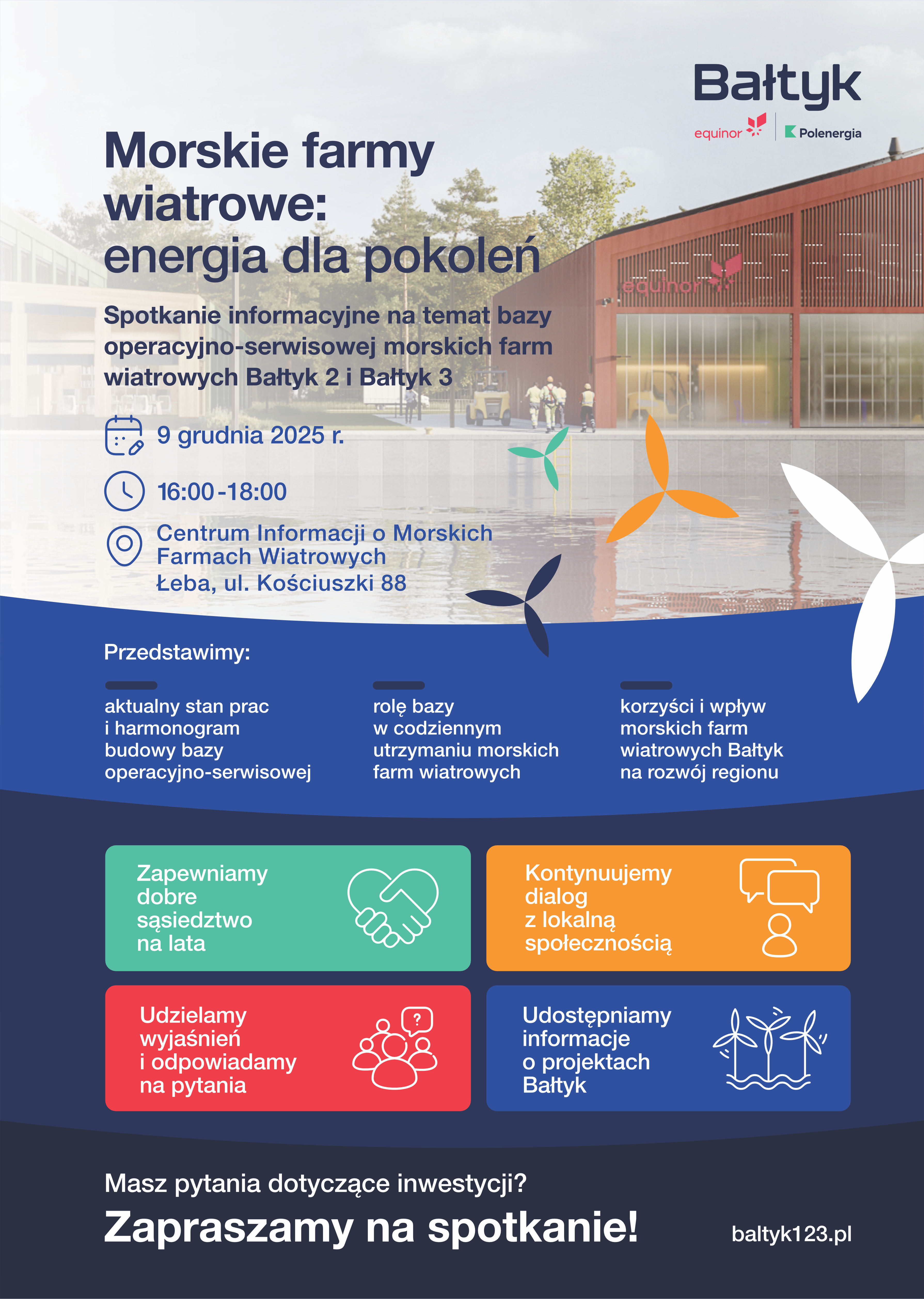 Zapraszamy mieszkańców Gminy Ustka oraz wszystkich zainteresowanych na spotkanie informacyjne dotyczące bazy operacyjno-serwisowej morskich farm wiatrowych Bałtyk 2 i Bałtyk 3. Wydarzenie organizowane jest przez Equinor i Polenergię – partnerów realizujących projekt farm wiatrowych na Bałtyku.